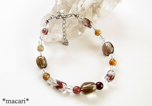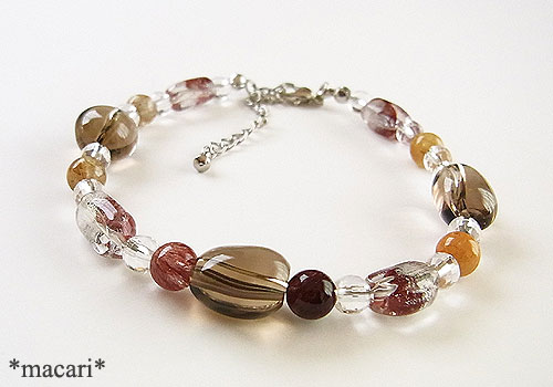 スモーキークォーツやルチルクォーツと組み合わせた落ち着いたカラーのブレスレットに仕上げました。
