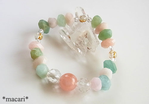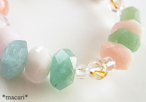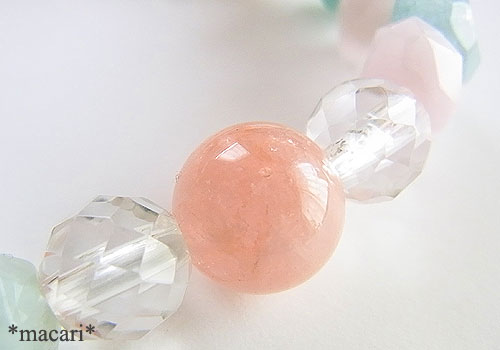 淡いパステルカラーのベリル(緑柱石)を繋いだ愛らしい雰囲気のブレスレットです。可愛らしい雰囲気でまとめていますが、石が大きめなので存在感がありますよ。