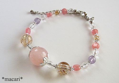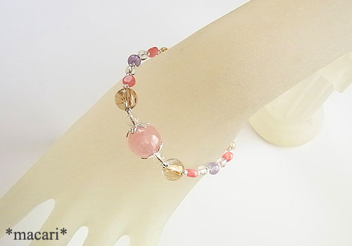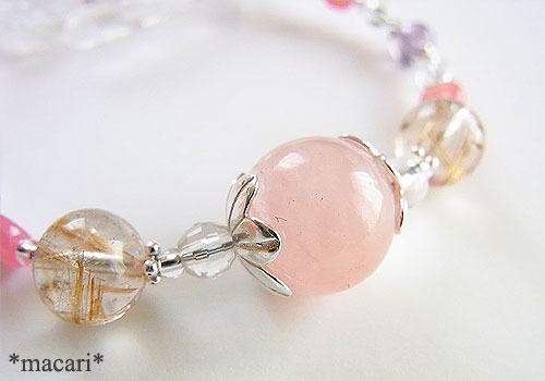 12ミリの大粒なモルガナイトを中心に飾り、ルチルクォーツ、ロードクロサイト、マリアライト、水晶を繋いだ華奢な雰囲気のブレスレットです。