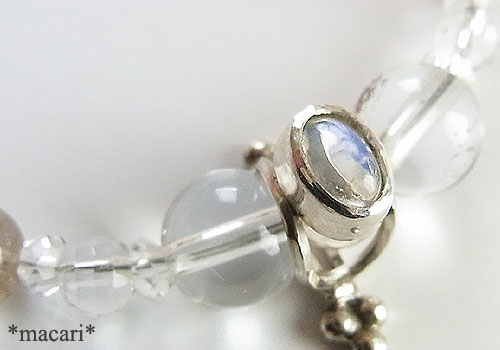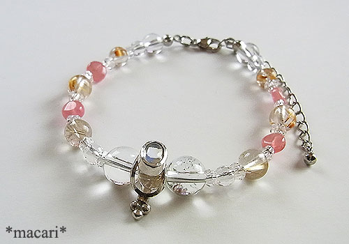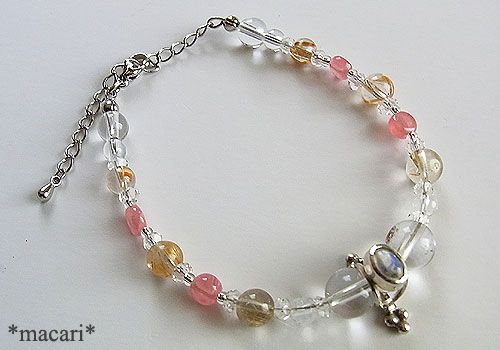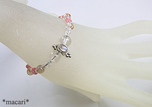 ルチルクォーツ、ロードクロサイト(インカローズ)、水晶を繋いだブレスに青いシラーが浮かぶぺリステライトをシルバーで飾り付けました。アジャスターが付いているので、ある程度調整できますが、サイズが大きいと飾りの部分が裏返ってしまうので、その場合はお直しいたします。(無料)