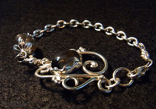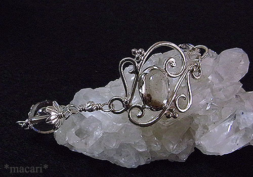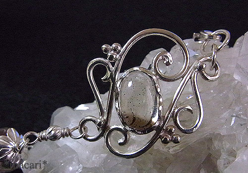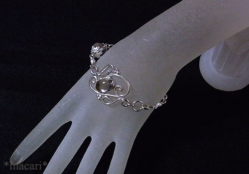 透明な部分と少しスモーキーな色合いの部分があるバイカラークォーツに満遍なくコーベライト(銅藍)が内包されている美しいルースを使い、唐草デザインのシルバーブレスに仕上げました。