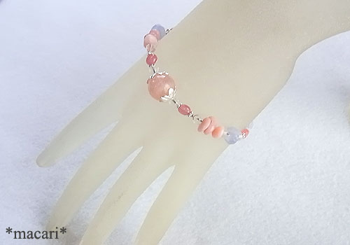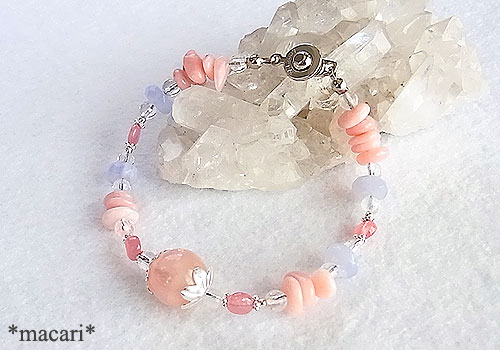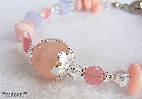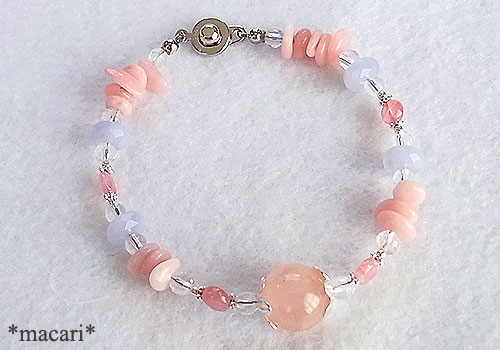 大粒のモルガナイト(ピンクベリル)をポイントに、ピンクオパール、ブルーレースアゲートインカローズを繋いだ愛らしい雰囲気のブレスレットです。