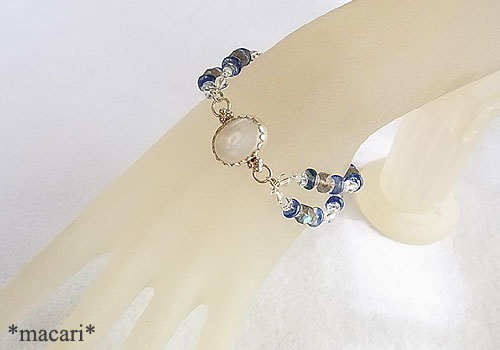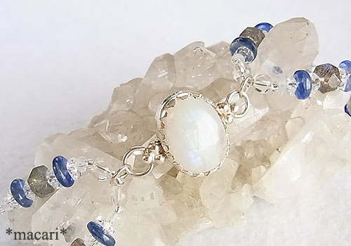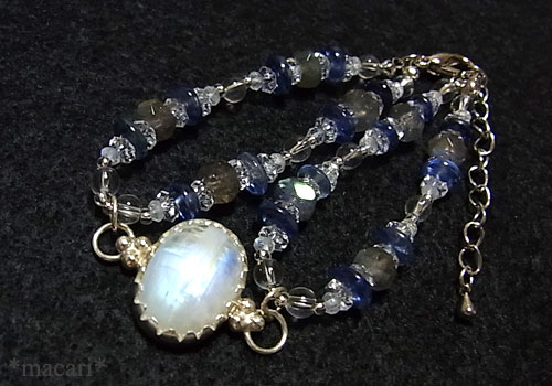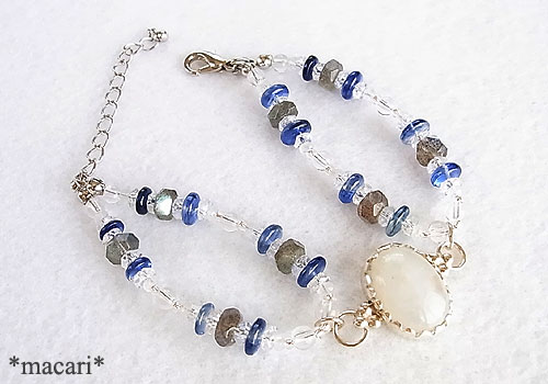 淡いブルーグリーンとイエローの光が浮かぶホワイトラブラドライトをシルバーで囲み、カヤナイト、ラブラドライト、水晶を通した個性的で美しいブレスレットに仕上げました。