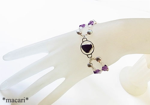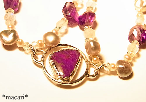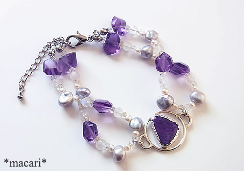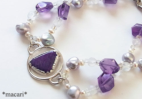 不定形型のスギライトをポイントにアメシスト、淡水パール、ブルームーンストーン(ラブラドライト)を繋いだブレスレットに仕上げました。こちらのスギライトは白熱灯で赤紫にカラーチェンジしますよ。
