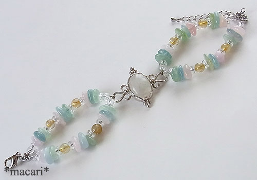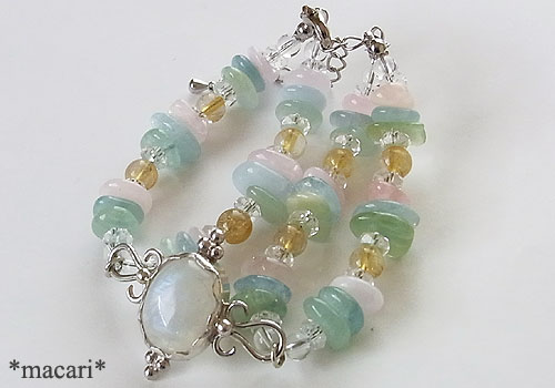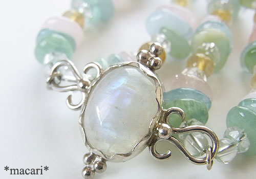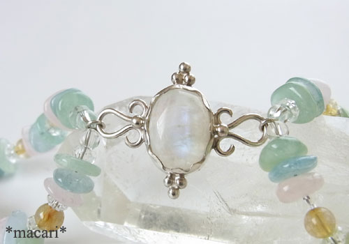 青白い輝きが浮かび上がるブルームーンストーンをシルバーで中央に留めベリルやルチルクォーツで繋いだ優しげだけど華やかな雰囲気のブレスレットに仕上げました。こちらのブルームーンストーンは鉱物的にはラブラドライトになります。クラックや内包物が多い石なので、予めご了承ください。