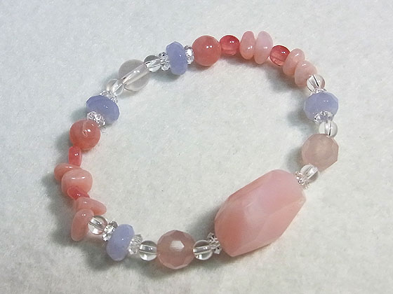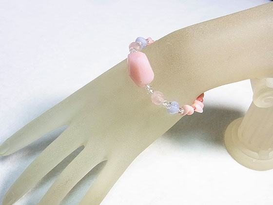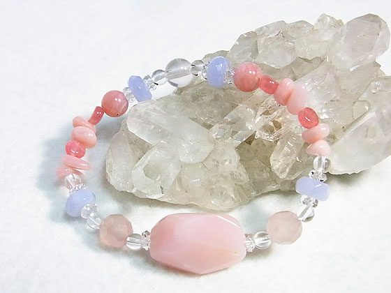 大粒のピンクオパールをポイントにローズクォーツ、インカローズ、ブルーレースアゲート水晶を繋いだ愛らしい雰囲気のゴムブレスです。