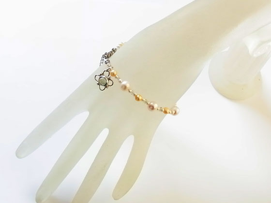 淡いグリーンの可愛らしいプレナイトをシルバーで留め、淡水パールのブレスレットに飾り付けました。 明るい色調が、これからの季節にピッタリなブレスレットです。