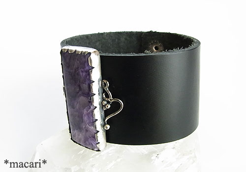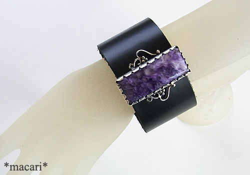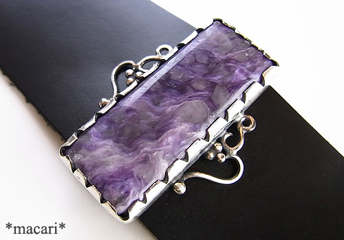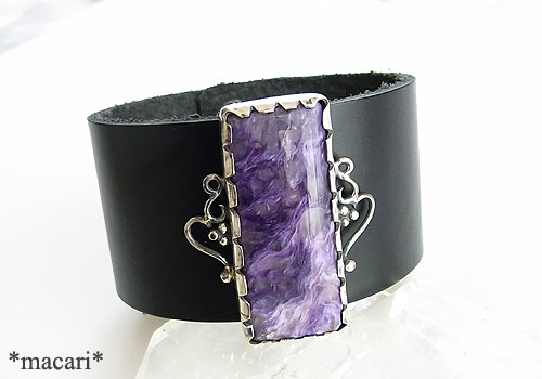 大粒のチャロアイトをシルバーで飾り、幅広の革ブレスに留めたブレスレットです。