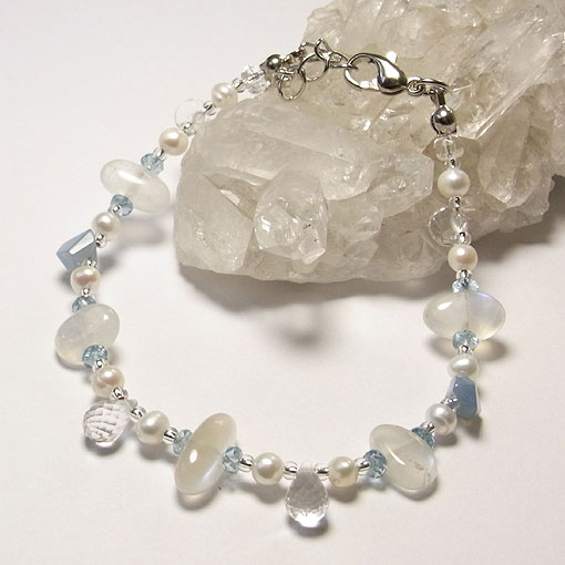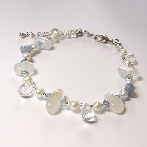 淡いブルーのシラーが浮かぶペリステライトとオーウィーブルーオパールのビーズを組み合わせた 爽やかな印象のブレスレットです。
