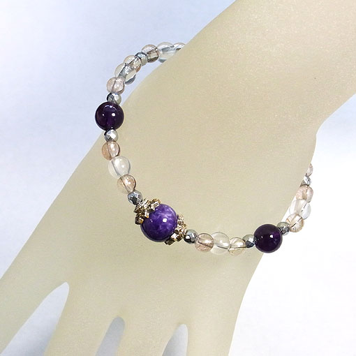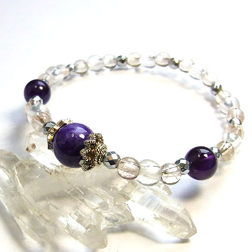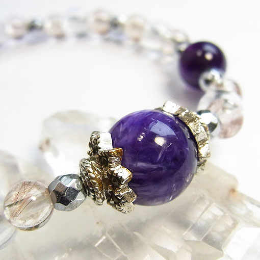 発色の美しいチャロアイトとアメシスト、水晶、磁気入りヘマタイトをつないだ 磁気入りのヘマタイト(人工)を使用しているので、時計との重ね着けはご注意ください。
