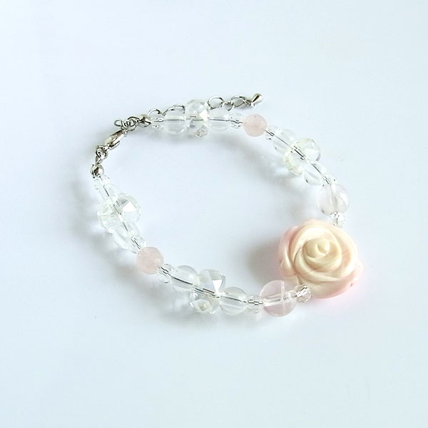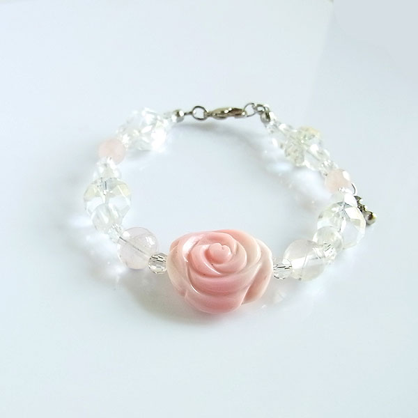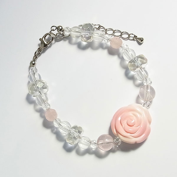 赤ちゃんの頬のような愛らしいピンク色のコンクシェルをポイントに使用し、ローズクォーツや コンクシェルの薔薇は裏側にも彫りがあるので、裏返ると白っぽい色合いの薔薇になります。