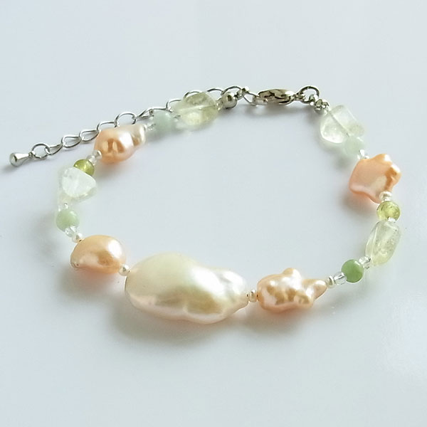 艶々の淡水パールとリビアングラス、グリーン系の天然石ビーズを組み合わせて、 春の日差しをイメージしたブレスレットに仕上げました。