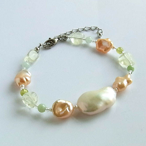 【使用石】 淡水パール 21×14ミリ 淡水パール オレンジ(自然色) 10〜11ミリ ビルマ翡翠 4ミリ グリーンガーネット 4ミリ リビアングラス 8ミリ前後 手首周り 18センチ+5センチ
