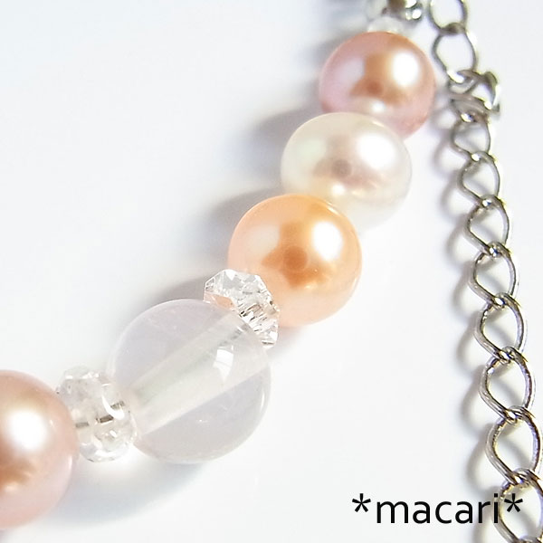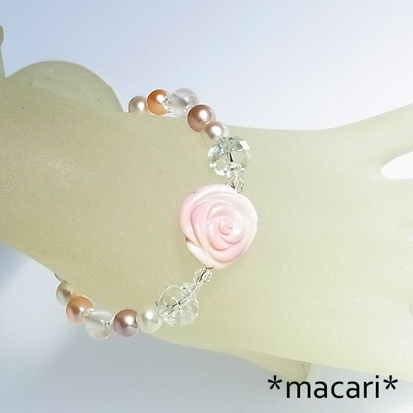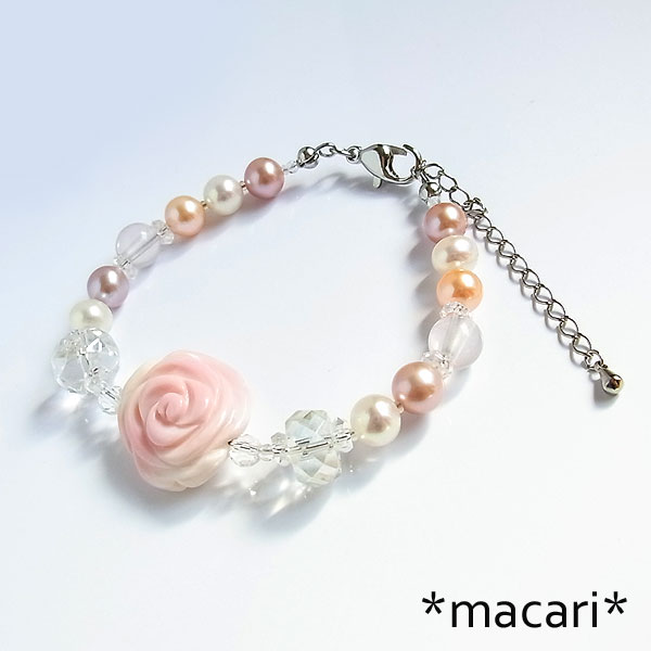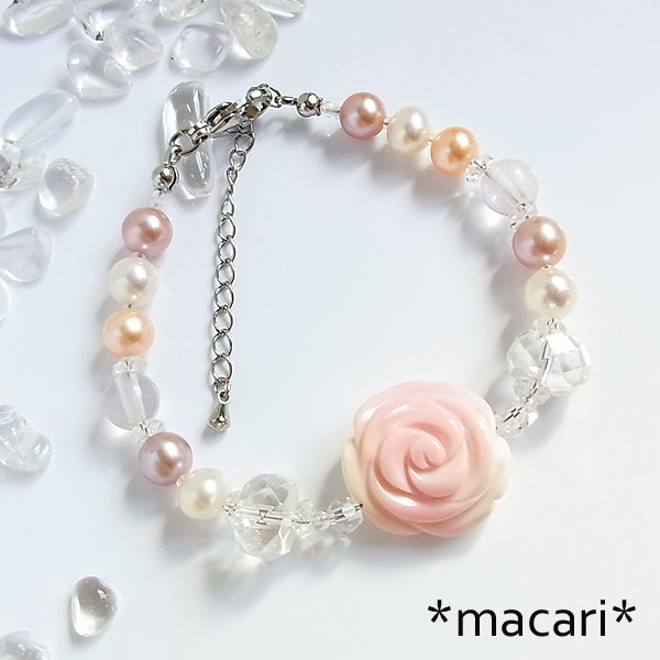 赤ちゃんの頬のような愛らしいピンク色のコンクシェルをポイントに使用し、ローズクォーツや アクアオーラ、高品質の淡水パールを繋いだ 可憐な雰囲気のブレスレットです。 コンクシェルの薔薇は裏側にも彫りがあるので、裏返ると白っぽい色合いの薔薇になります。 *コンクシェル* カリブ海で採れる巻貝で内側が美しいピンク色をしています。 高級真珠コンクパールの母貝。 乱獲の影響か、近年では大きなものが取れにくくなっており、ワシントン条約の対象にもなっています。