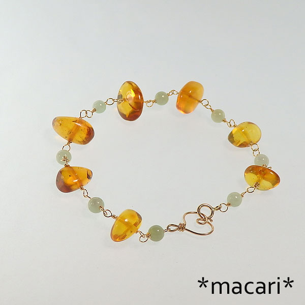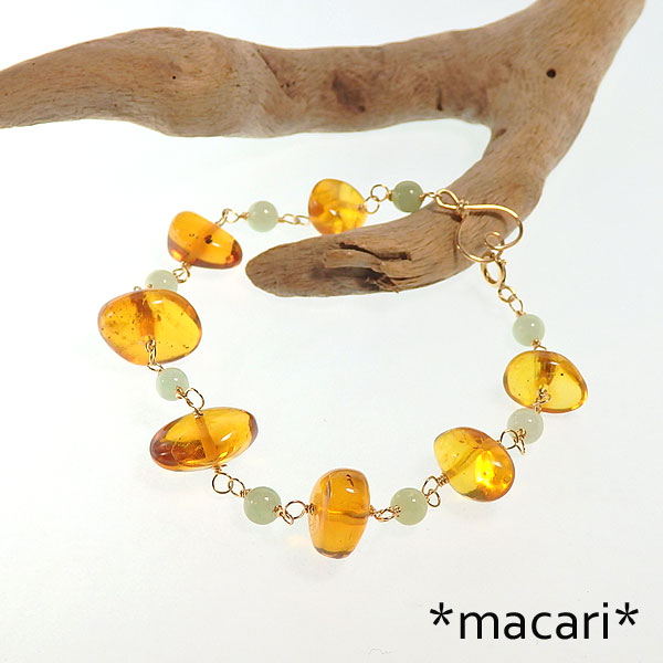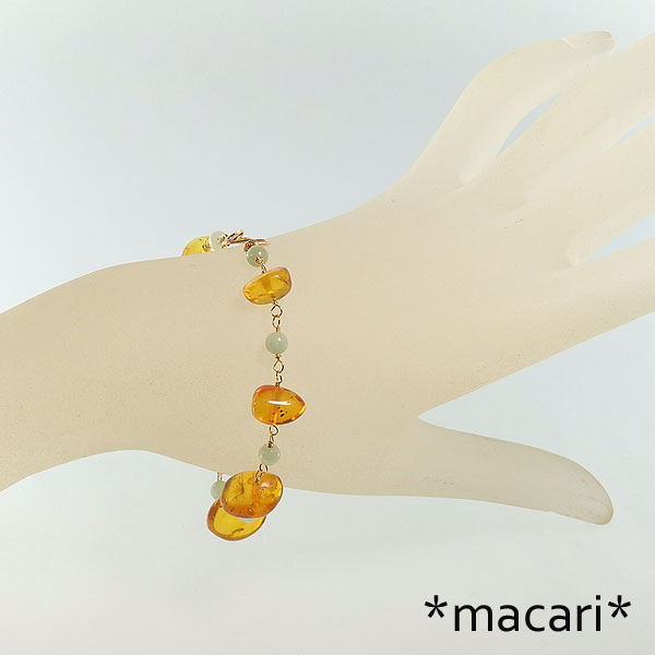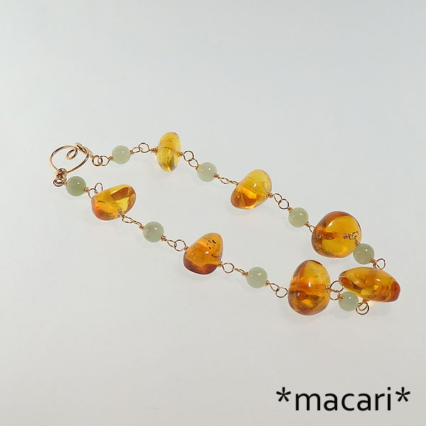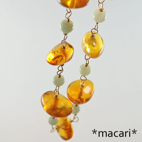 蜂蜜のような色合いが美しいアンバー(琥珀)と淡いグリーンのビルマ翡翠を こちらの琥珀はドミニカ産です。 蛍光性がわずかに見られますので、暗がりでブラックライトを当てると インクルージョンやクラックが見られますので、予めご了承ください。 こちらはp_1114のペンダントトップが付属します。 |