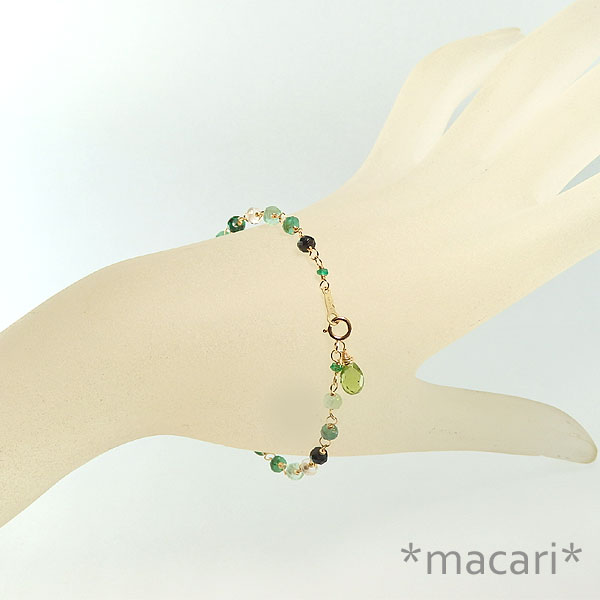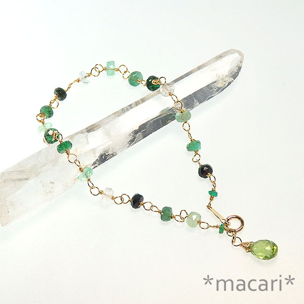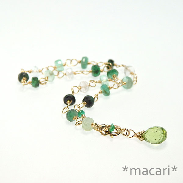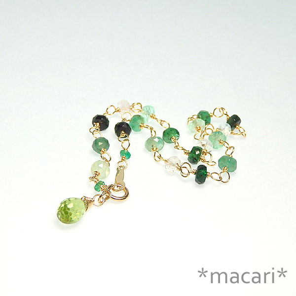 5月の誕生石エメラルドと明るいグリーンのペリドットを組み合わせた 爽やかなグリーンのエメラルドは新緑を思わせる美しい色合いで、まさに5月にふさわしい石だと思います。 色の濃淡が様々なので、バランスよくつないでみました。 両端の小さなエメラルドはコロンビア産のもので、色合いが少し違います。