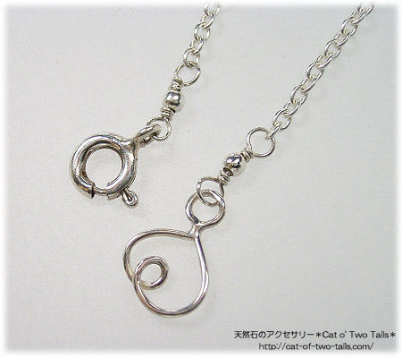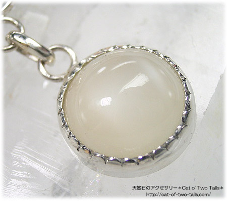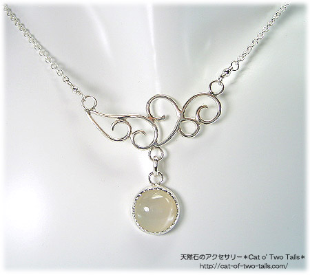 月光のような輝きの乳白色 ムーンストーンを唐草のネックレスに仕上げました。角度によってキャッツアイも見られます。ムーンストーン特有の優しげな温かみのあるシラーは、見ていて飽きませんよ。