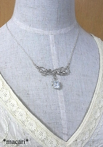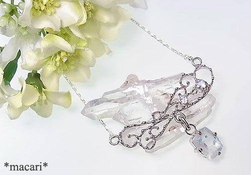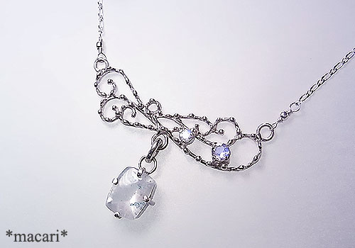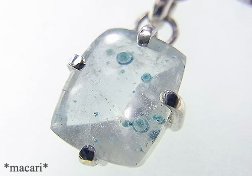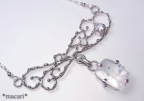 ミントブルーのコロンとした丸いジラライト(銅の珪酸塩鉱物)を内包した水晶を唐草飾りにぶら下げ、ブルームーンストーンを飾り付けた個性的なネックレスに仕上げました。