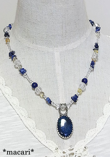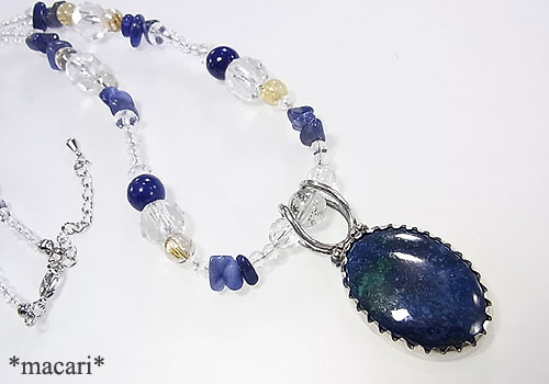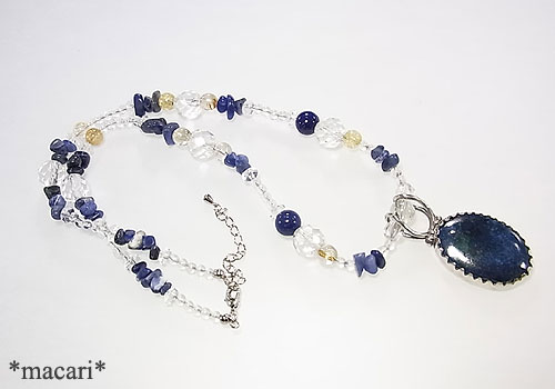 トップに大粒のクォンタムクアトロシリカをあしらい、ソーダライト、タイチンルチルクォーツ、ラピス、クォーツを繋いだ落ち着いた雰囲気のネックレスです。クォンタムクアトロシリカはシャタカイト、クリソコラ、 ダイオプテーズ、スモーキークォーツ、 マラカイトの混合石なのですが、こちらの石は趣が少し違うので、入っている鉱物が違うかもしれません。仕入れたときの名前で出していますが、ちょっと怪しいので(?)がついています。(^^;雰囲気的には、アジュラマラカイトっぽい色合いの面白い混合石です。