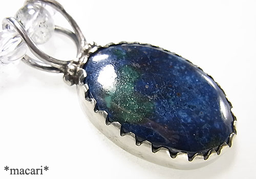 ぱっと見るとソーダライトのような青さが大部分を占め、少しマラカイトのグリーンが見られます。よく見ると赤い点状の模様が見られ、角度を変えながら見るとその部分がメタリックに光ります。ひょっとしたら、少しヘマタイトが入っているかも??