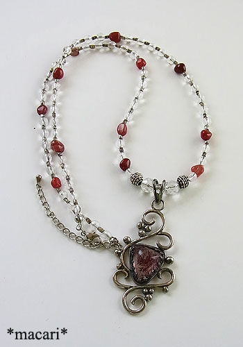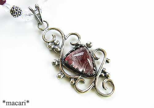 ゲーサイトやレピドクロサイトなどを内包した水晶を唐草デザインで飾りつけ、水晶とアンデシンビーズで繋いだ落ち着いた雰囲気のネックレスです。