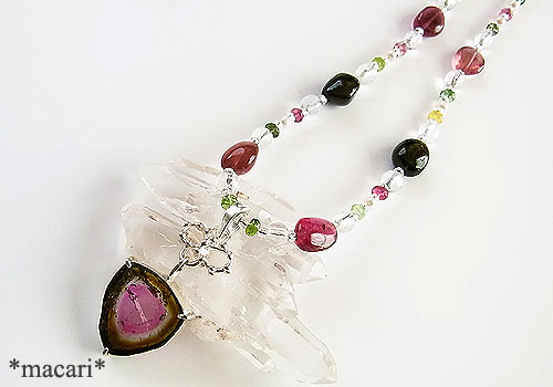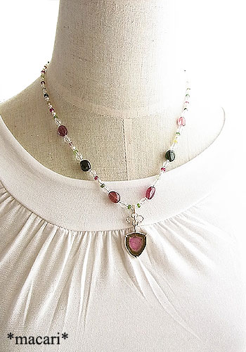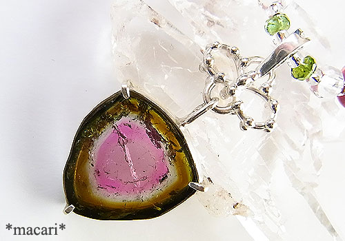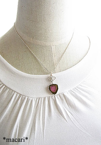 ウォーターメロントルマリンのスライスカットをシルバーで留め、トルマリンと淡水パール、グラスビーズで繋いだネックレスにぶら下げてみました。 バチカン部分が開閉式なので、ネックレスからはずしてお手持ちのチェーンなどに通してもお使いいただけます。 内部にクラックやインクルージョンが見られますので、あらかじめ御了承ください。