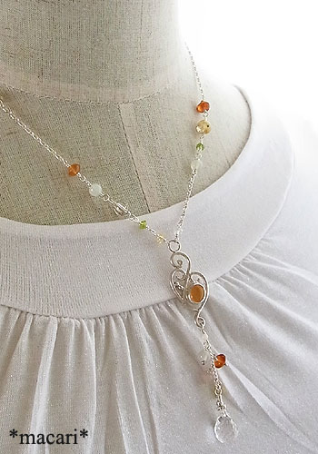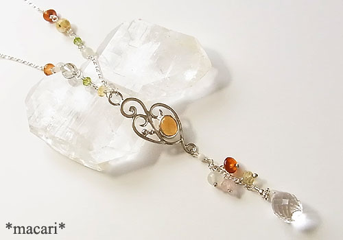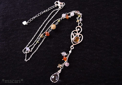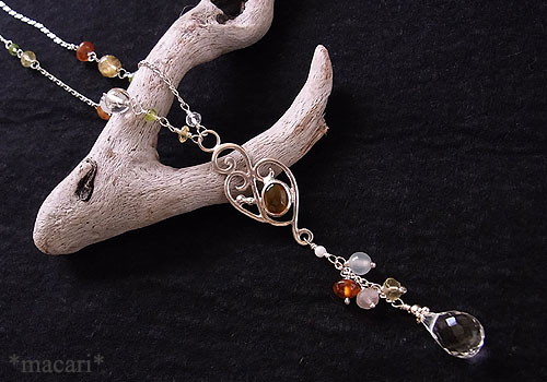 唐草飾りにメキシコオパールを留め、各種天然石を繋いだ、軽やかな印象のY字ネックレスに仕上げました。