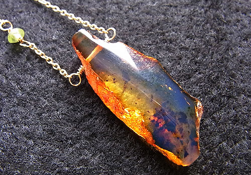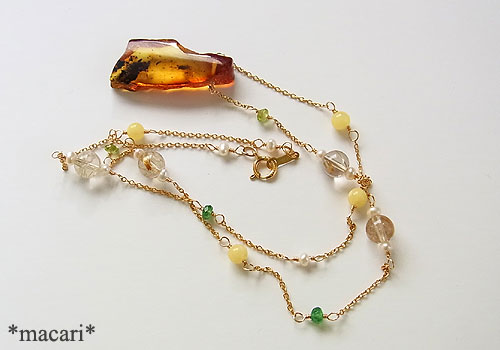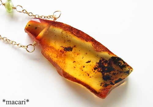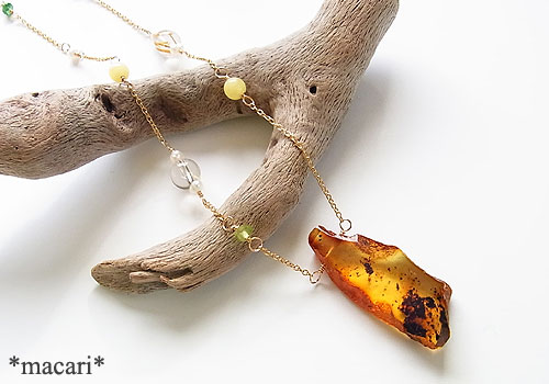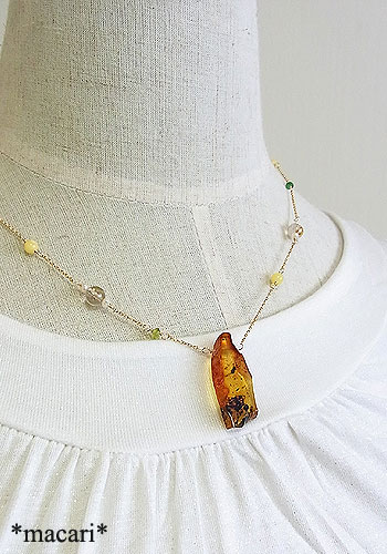 ブルーアンバーの原石を両面だけ磨き、自然の風合いを残した面白いルースをトップに繋ぎミルキーアンバーやペリドット、グリーンガーネットを繋いだ華奢な雰囲気のネックレスです。