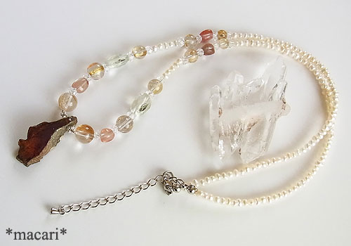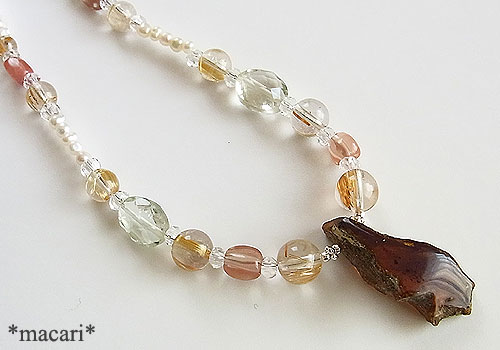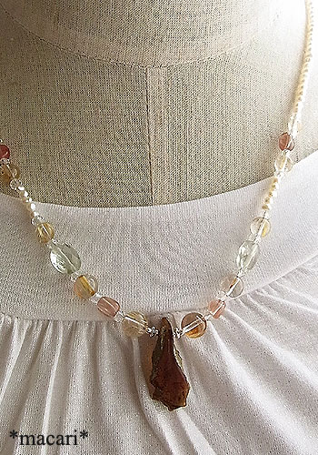 ブルーアンバーの原石を両面だけ磨き、自然の風合いを残した面白いルースをトップに繋ぎルチルクォーツ アンデシン、グリーンアメシスト、水晶、淡水パールを繋いだ華奢な雰囲気のネックレスです。