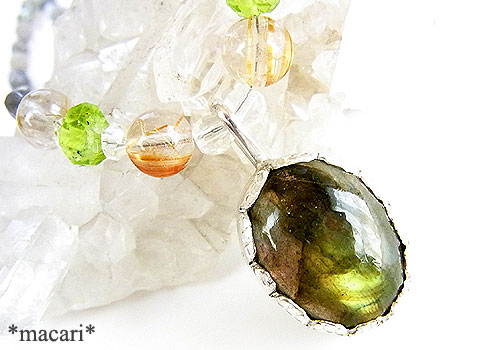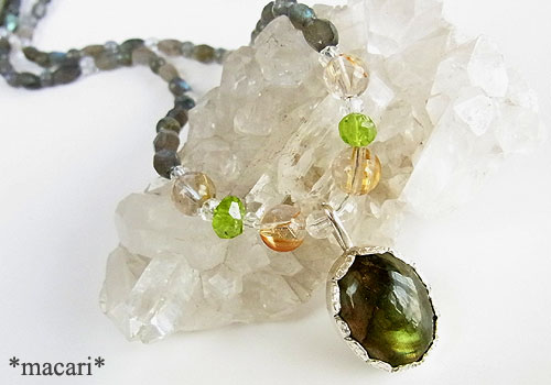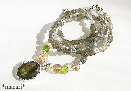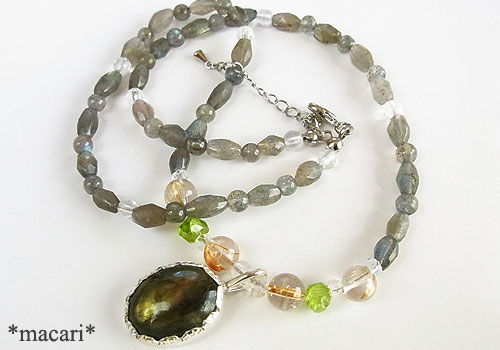 グリーンやオレンジの光が浮かぶラブラドライトのルースをシルバー枠で飾り、ルチルクォーツ、ペリドット、ラブラドライトのビーズを繋いでネックレスに仕上げました。こちらで使用のラブラドライトのビーズは手研磨なので、形が不揃いだったり窪みが合ったりしますので、お値段がお安くなっております。