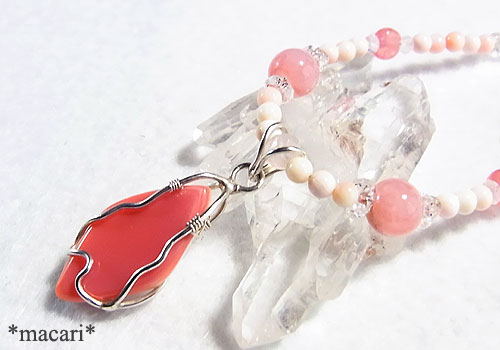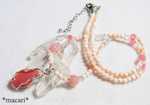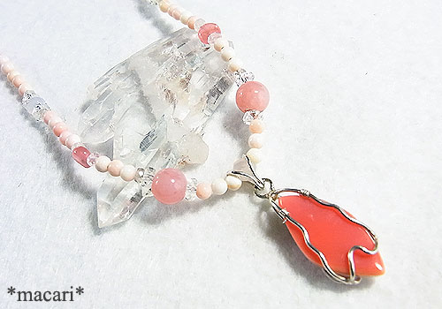 濃いピンク色のコンクシェルのルースを銀線で包み、インカローズ、ピンクオパール、コンクシェルのビーズを繋いだ華奢で愛らしい雰囲気のネックレスです。