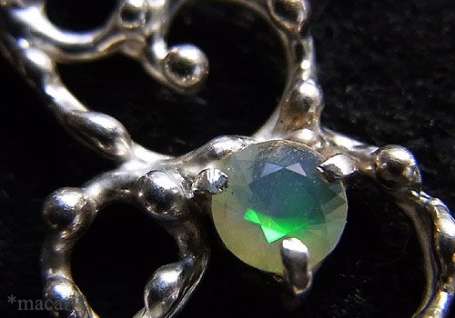 グリーンアメシストのマーキスカットを唐草デザインに飾りつけ、小粒のエチオピアオパールを留めた華奢な雰囲気のネックレスです。エチオピアオパールは小粒ですが、グリーンやオレンジの遊色が綺麗です。