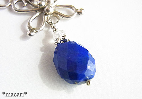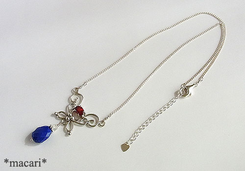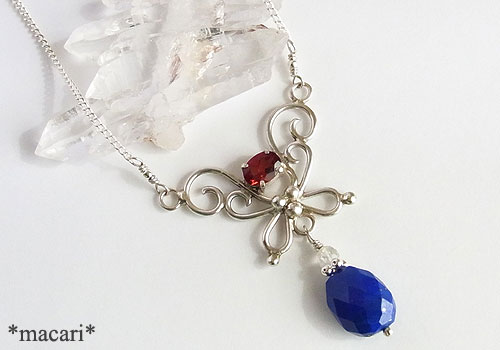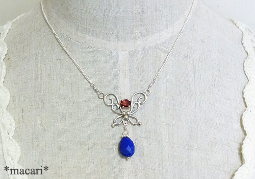真っ赤なアンデシンをシルバーワイヤーで制作した蝶のモチーフに留めラピスのビーズを飾り付けた個性的なネックレスです。こちらで使用のアンデシンは、銅の拡散処理を施されています。