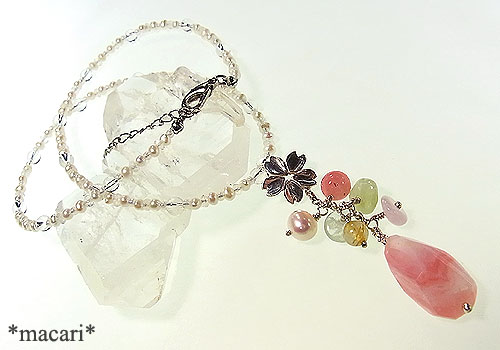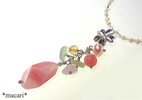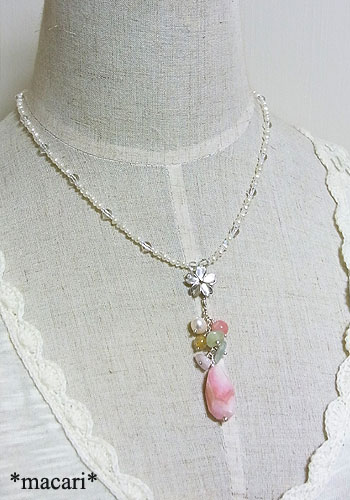 シルバーの桜モチーフにピンクオパールや淡水パール、ベリルを飾りつけ華奢で愛らしい雰囲気のネックレスに仕上げました。