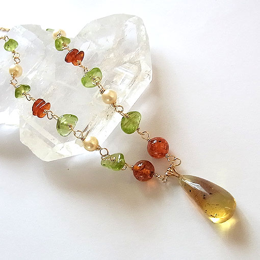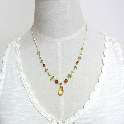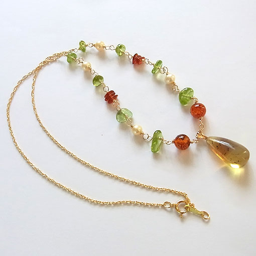 僅かに内包物が見られますが、全体的にクリアなドミニカ産のブルーアンバーをk14GFワイヤーで繋ぎ、アンバー、ペリドット、淡水パールを組み合わせた軽やかな印象のネックレスに仕上げました。
