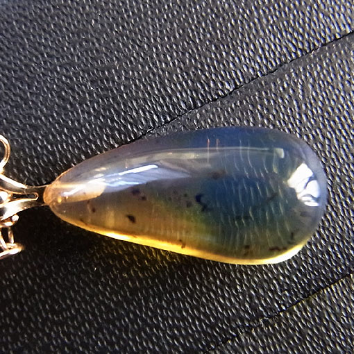 長めに作っていますので、黒いお洋服の上に着けるとトップのブルーアンバーの蛍光が美しく見られます。