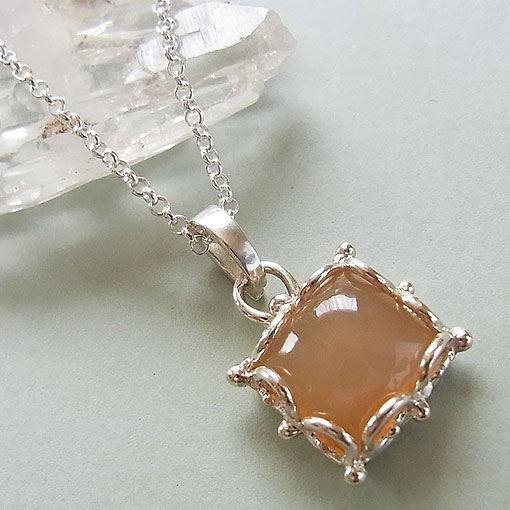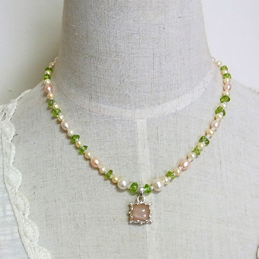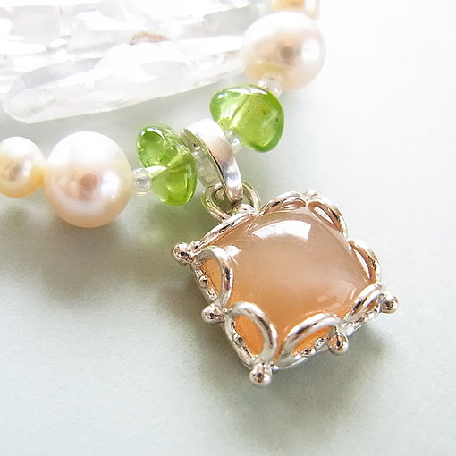 キャンディのような可愛いオレンジ色のムーンストーンをシルバーで飾りつけ淡水パールとペリドットのネックレスに留めてみました。