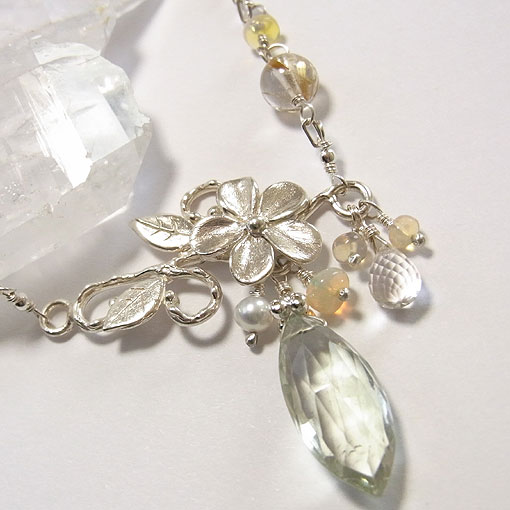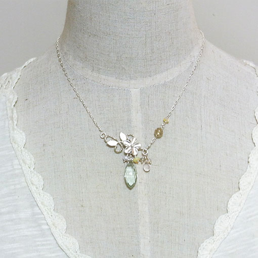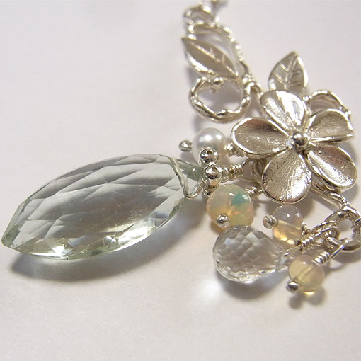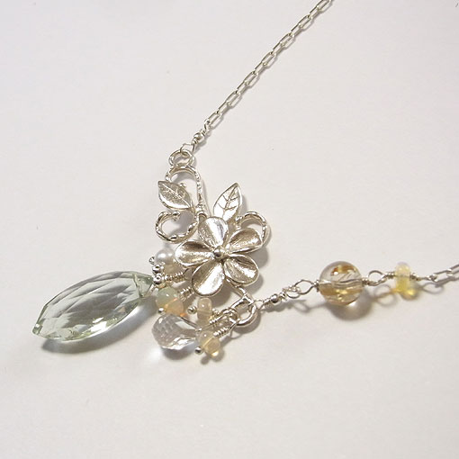 シルバーで作り上げたフラワーモチーフにグリーンアメシストやエチオピアオパールを飾り付けた アシンメトリーなネックレスです。