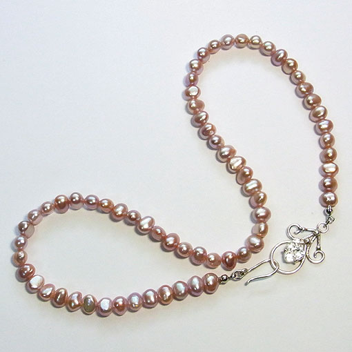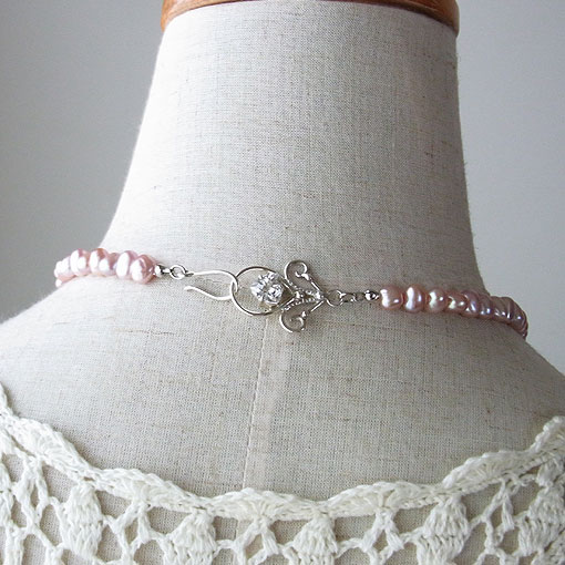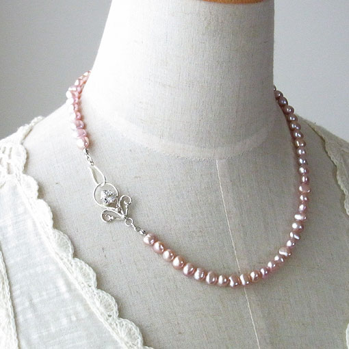 光源によって、淡水パールの色合いが少し違って見えるようです。 画像1、2、3枚目は蛍光灯で撮影。 トルソー着用画像は窓越しの自然光で撮影しています。