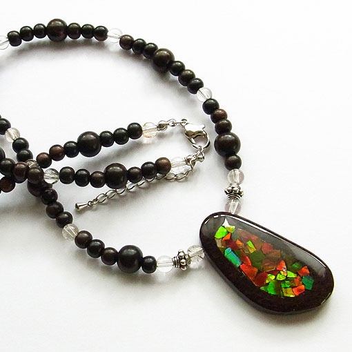トップ部分に重さがあるため、ネックレス部分はウッドビーズを使用して軽く仕上げています。 | |