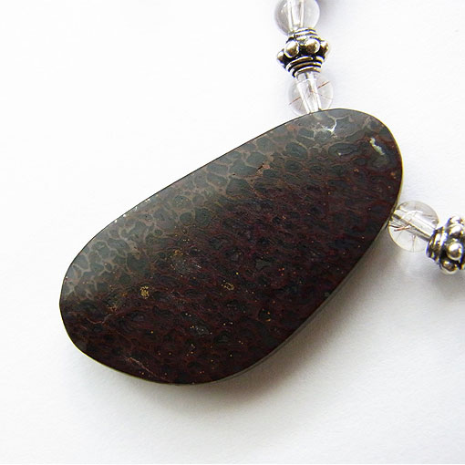 ダイナソーボーン&アンモライトのネックレス 恐竜の骨の化石にアンモライトを張り合わせた大粒のトップが面白いネックレスです。