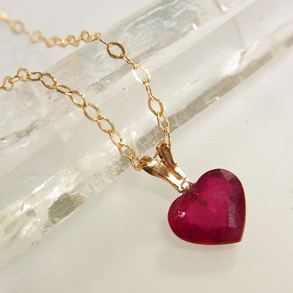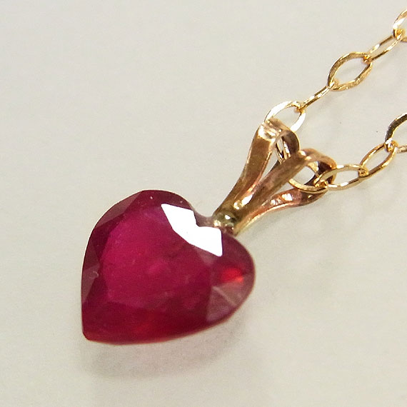 小粒のルビーのハートカットをシンプルなペンダントネックレスに仕上げました。 こちらのルビーには含侵処理や加熱処理などが施されています。 また、裏側なので目立ちませんがバチカン金具のロウ着の色が少し違っているので かなり価格を低く設定しております。予めご了承ください。
