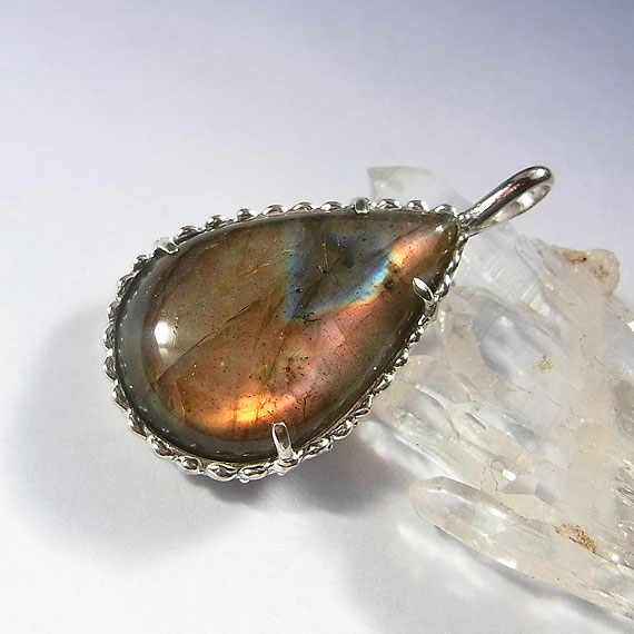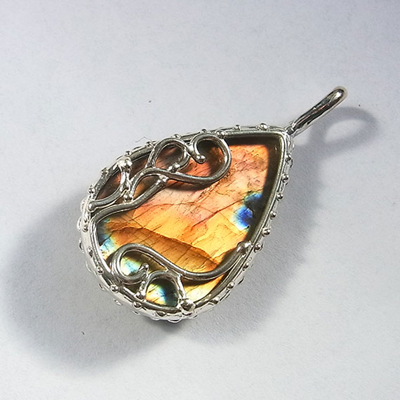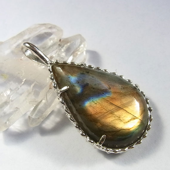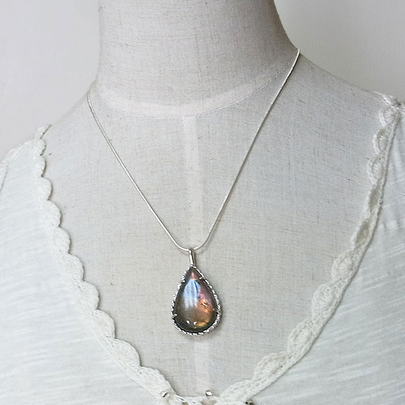 ラブラドライトのペアシェイプペンダント ペアシェイプカボションの大粒ラブラドライトを粒飾りのペンダントにしました。