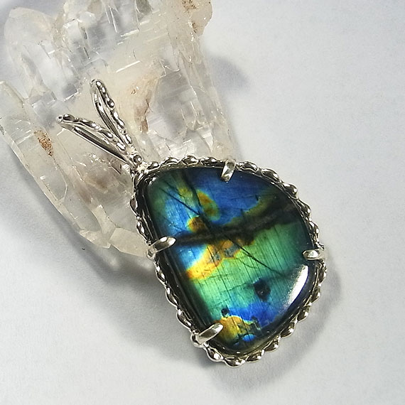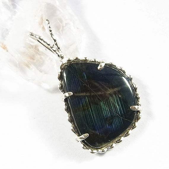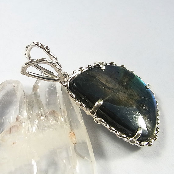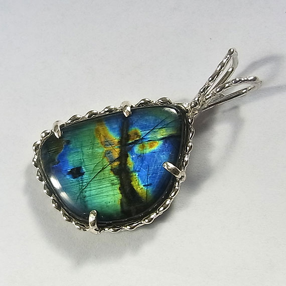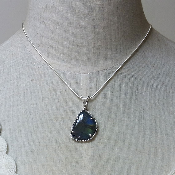 スペクトロライトのペンダント フリーシェイプのスペクトロライトを粒飾りのペンダントに仕上げました。