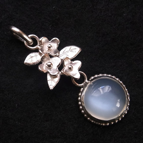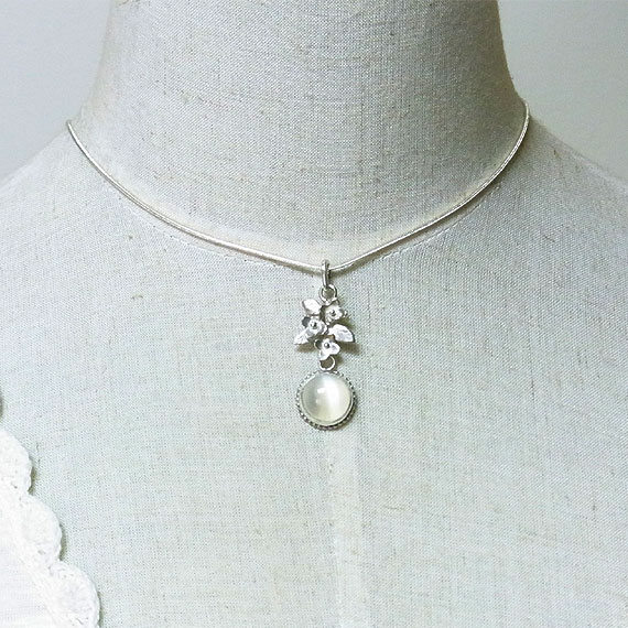 ハッキリしたキャッツアイの浮かぶ美しいムーンストーンを 小花飾りにあしらったペンダントに仕上げました。
