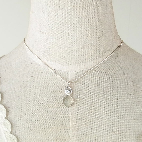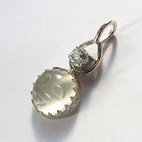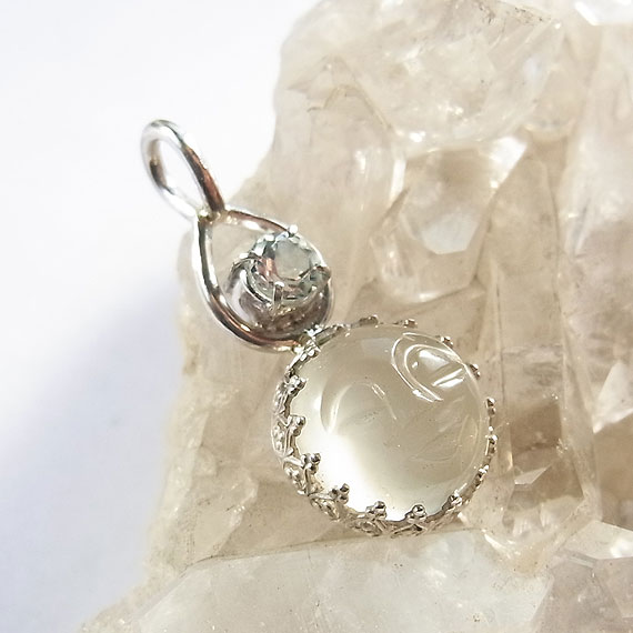 ムーンストーンとアクアマリンのペンダント 笑顔が彫り込まれた神秘的な輝きのムーンストーンに小粒のアクアマリンを組み合わせた ムーンストーンとアクアマリンの色合い?輝きはとても相性がよく、お互いの美しさを引き立たせていますよ。