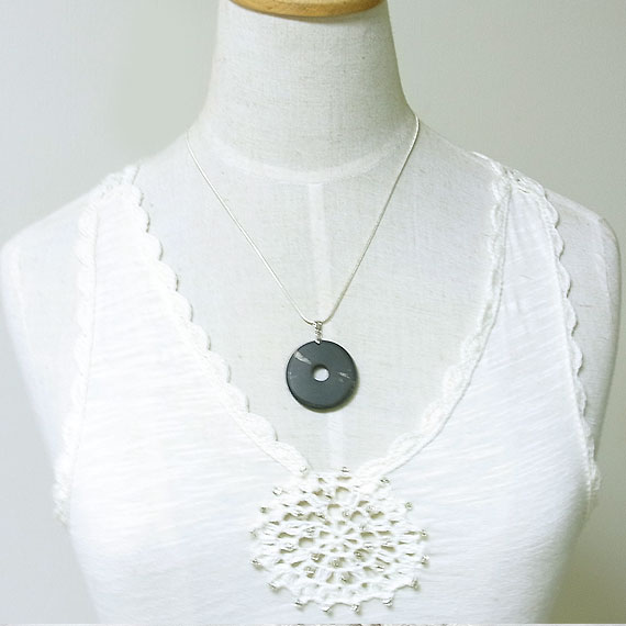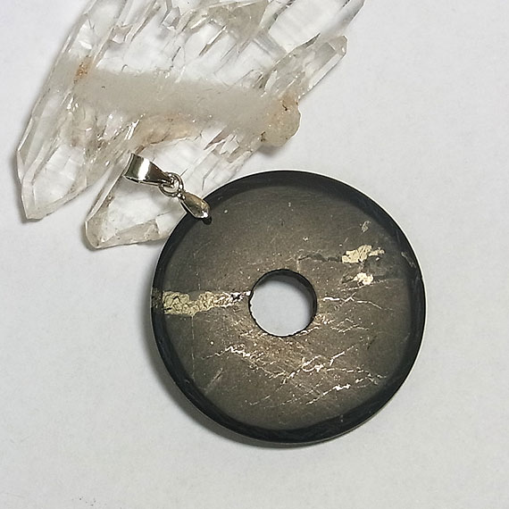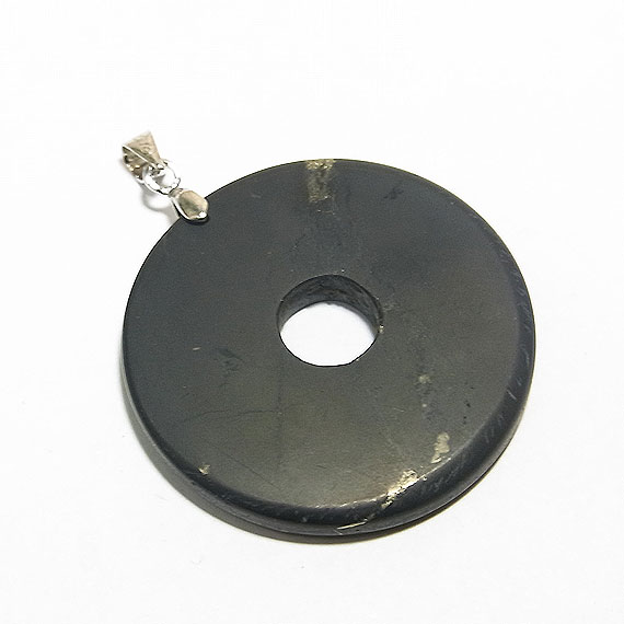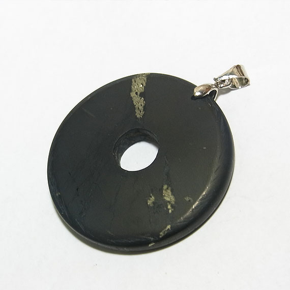 シュンガイトのペンダント ドーナツ状にカットされたシュンガイトをシンプルなペンダントに仕上げました。 こちらはメタリックな内包物が見られます。