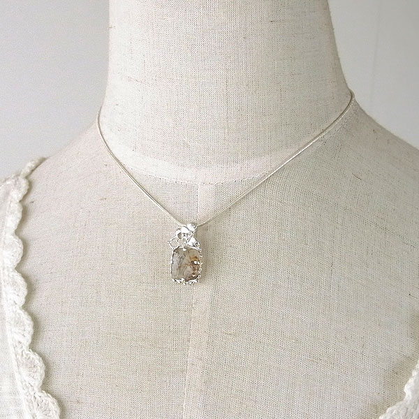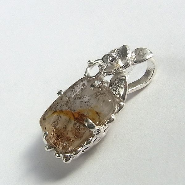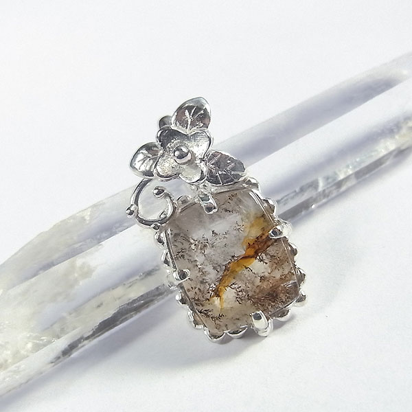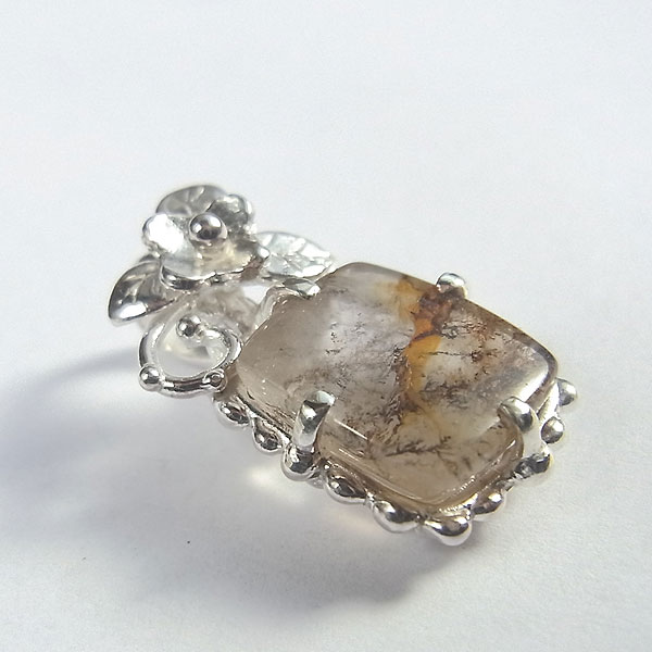 デンドリッククォーツの小花飾りペンダント 樹枝状の模様が綺麗に入り込んだクォーツを小花をあしらったペンダントに仕上げました。