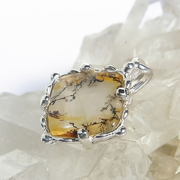 植物のような模様が美しいデンドリッククォーツを粒飾りのシンプルなペンダントに仕上げました。 模様を楽しむ石なので、大ぶりにカットされることが多い石ですが、小ぶりで模様の綺麗なものを使って お求めやすい価格で制作いたしました。 |