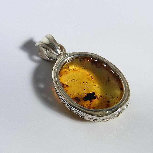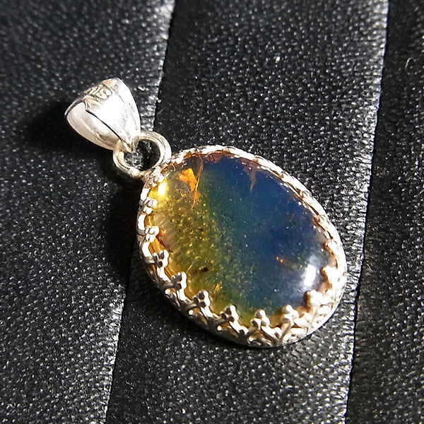 透明感のあるブルーアンバーのカボションを細かな模様の飾り枠で留めた シンプルなペンダントです。 ブルーアンバーはドミニカで産出する琥珀で、紫外線に当たると幻想的なネオンブルーに蛍光します。 こちらは少し蛍光が弱いものになりますが、ブラックライトを当てると鮮やかな輝きを浮かべます。 若干内包物やクラックが見られますので、ご了承ください。